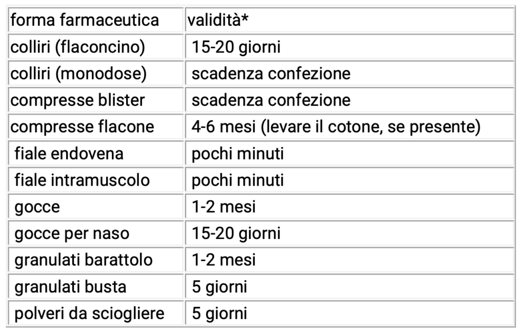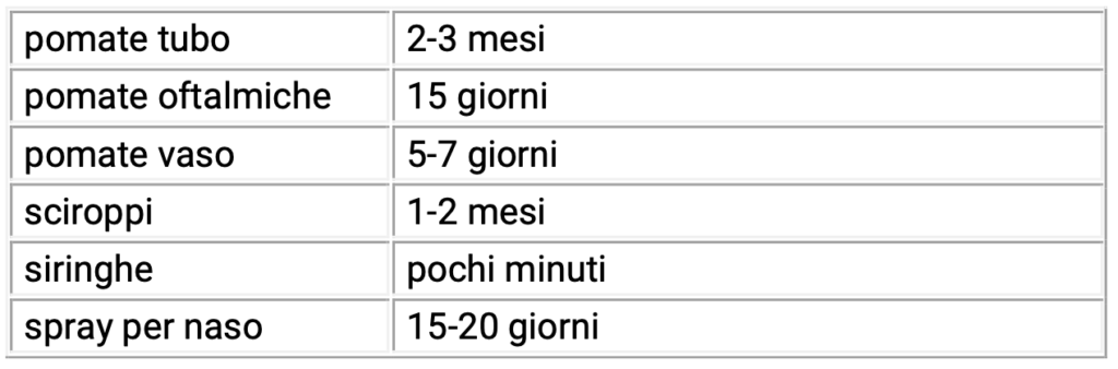 Per questo motivo è opportuno annotare sulla confezione la data di prima apertura ed è consigliabile ricavare dalla seguente tabella -riportata a titolo prudenziale ed indicativo- il periodo di validità, ove non fosse specificamente indicato sul foglietto illustrativo: